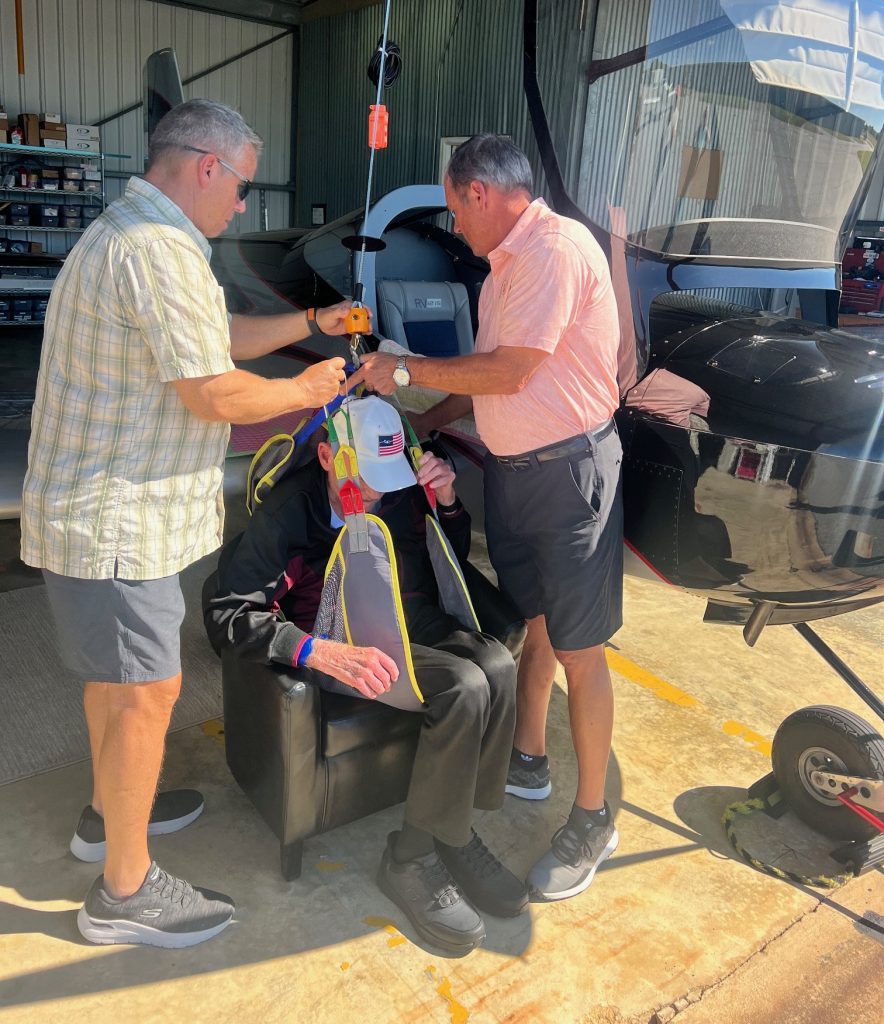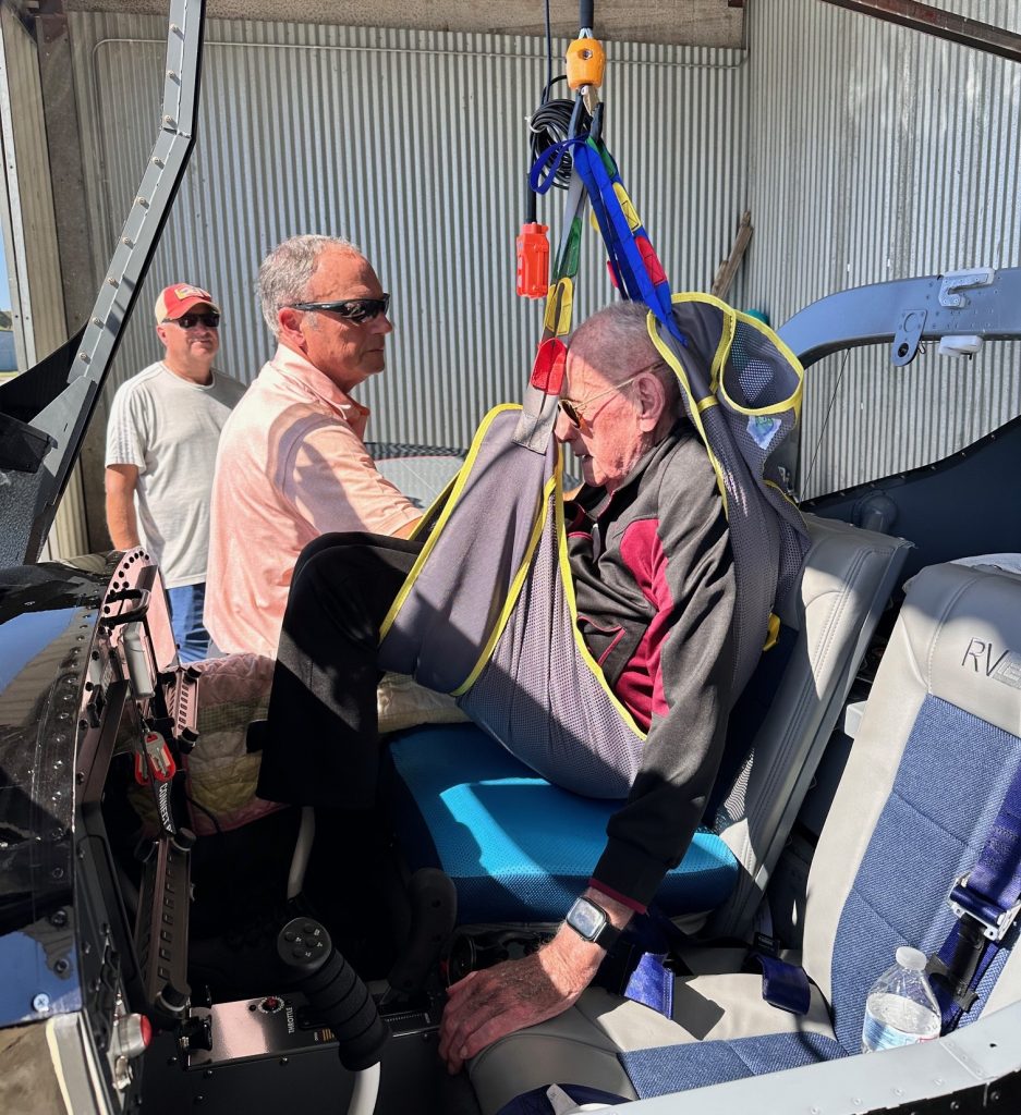 Since becoming wheelchair-bound, General Pezzullo had believed his flying days were behind him. Through creativity, determination, and teamwork, his family, friends, and the airport community came together to devise a safe hoist system using a full-body sling to gently lower him into Rich’s experimental RV-12 aircraft (N582VA). Once settled in the cockpit, the General was excited and ready to fly.