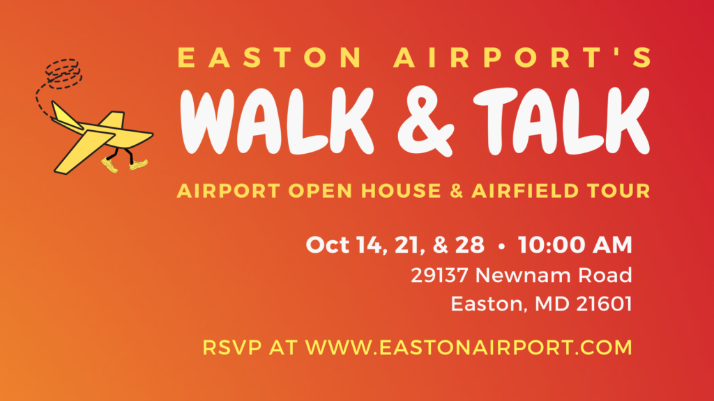 Easton Airport is excited to invite the public to a special fall edition of the Walk & Talk airport open house series. The event will offer the community an on-site tour of the community airport with a trek through designated sections of the airfield on October 14, 21, and 28.