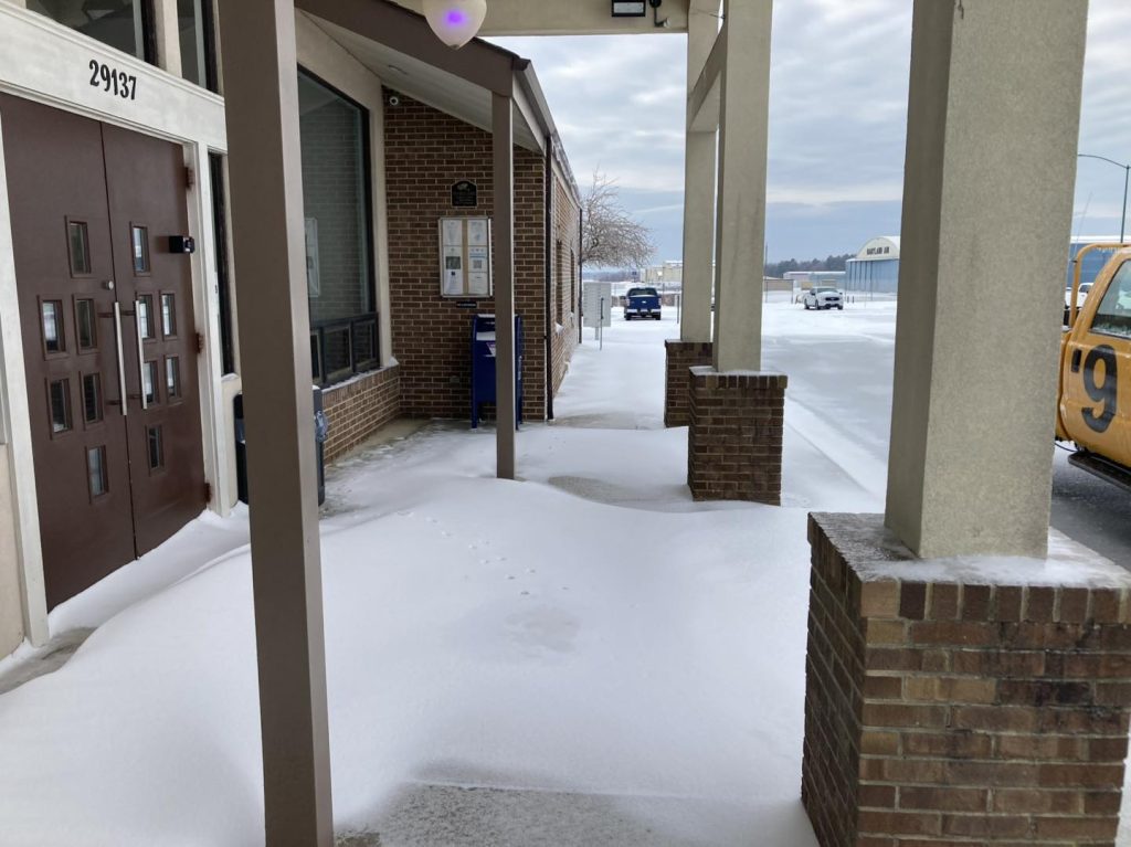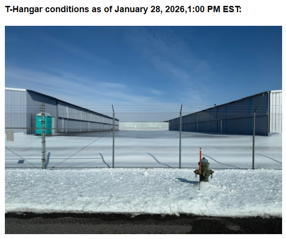 • Several T-Hangars remain inaccessible and hazardous with several inches of ice on the ground and ice sliding off the roofs, blocking doors.